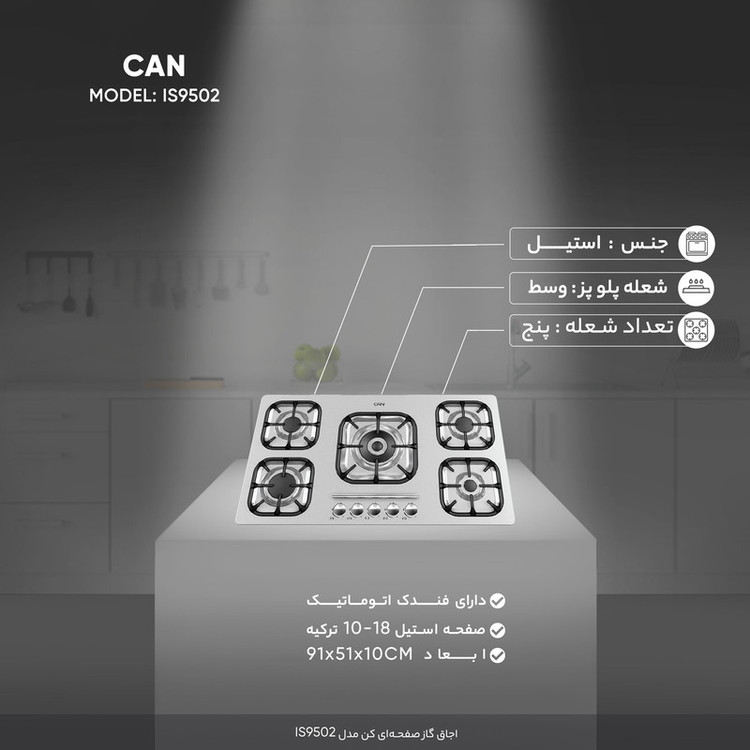 شرکت کن با اتکا به توان تولید داخلی محصول جدید IS 9502 را با استفاده از سر شعله و شیر کنترل ساخت شرکت جنرال تولید نموده است. اجاق گاز کن استیل مدل IS9502 از جنس استیل 18-10 و با کیفیت است و نیز قدرت شعله مناسب و ولومهای مقاوم به حرارت از دیگر ویژگیهای این اجاق گاز است. این اجاق در برابر ضربه و دمای بالا مقاوم است. توان حرارتی شعله پلوپز 3/8 کیلووات است که همانند اجاق گازهای مبله است و باعث پخت سریعتر غذا و جوشیدن سریعتر آب میگردد. در مدل گاز صفحهای کن حداکثر فاصله بین مشعلها در نظر گرفته شده تا بتوان تعداد ظروف بیشتری را به طور همزمان روی اجاق گاز استیل استفاده نمود.