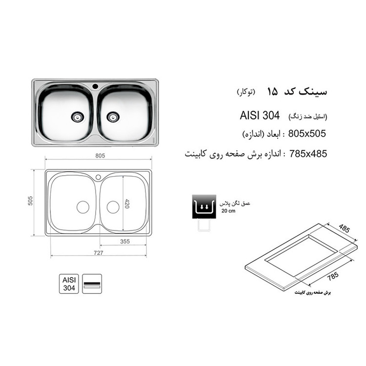 لوازم سیفون دارد به همراه زیراب فانتزی بزرگ ضخامت ورق : 0/8 میلیمتری