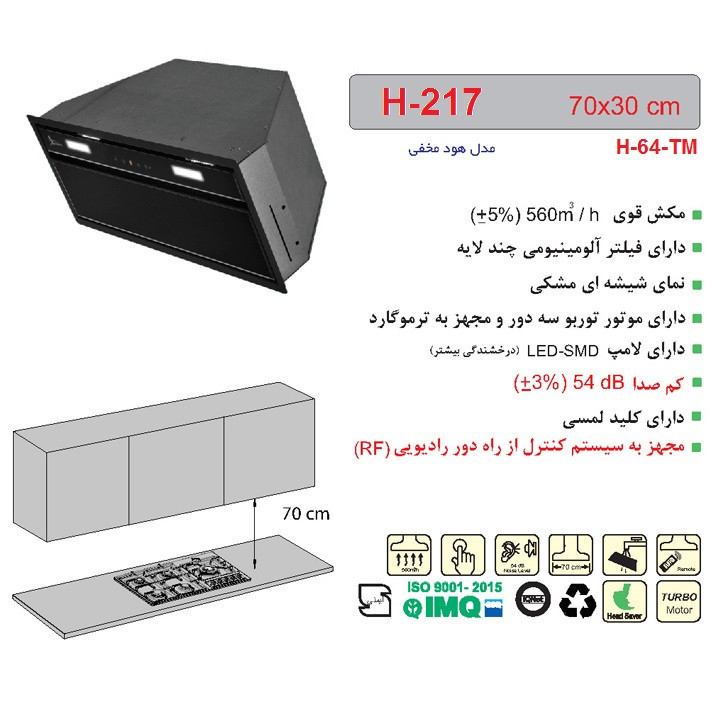 هود مخفی H-217 اخوان همان مدل H64-TM است با عملکرد موتور بهتر، دارای عرض 70 و حجم مکش قوی است، موتور توربو سه دور و مجهز به ترموگارد است. دارای نمای شیشه ای مشکی است. هود H217 اخوان مدل خیلی پرطرفدار در بین هودهای اخوان است.
