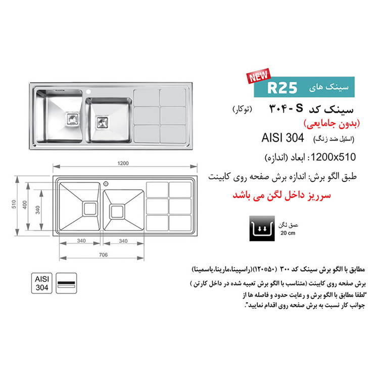 نوع زیراب : مربع با تخلیه سریع ضخامت ورق : یک میلیمتر